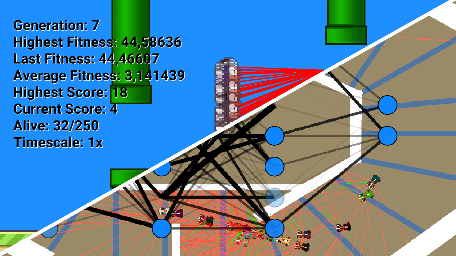 Evolutionary neural networks from scratch in Unity for Flappy Bird & Drift Racing.